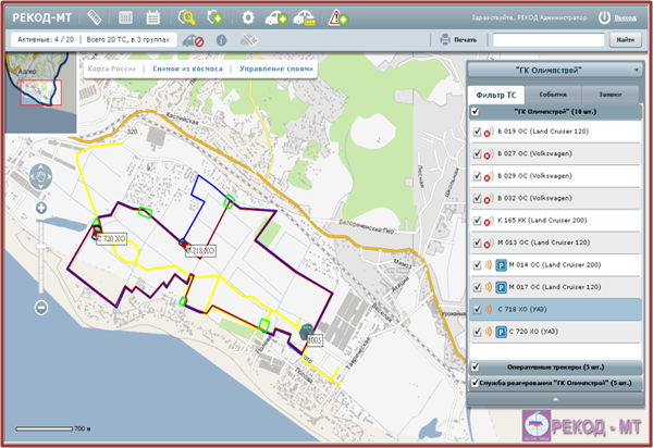 Создание и выбор оптимального маршрута следования ТС или группы техники. В памяти системы сохраняются маршруты перемещения транспортных средств.